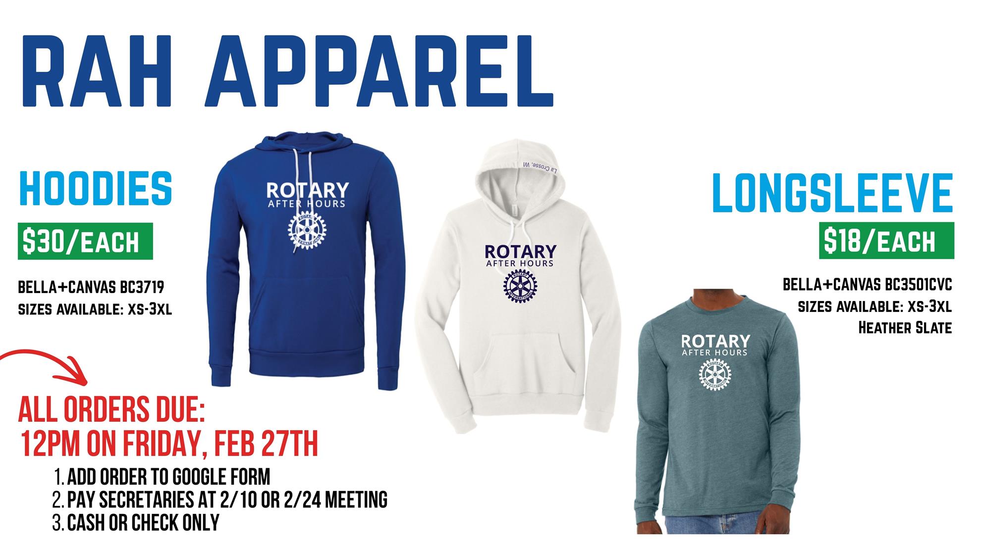 Perfect for meetings, service projects, socials, coffee runs, or just RAH'pping the club wherever you go. Hoodies and long-sleeve tees are up for grabs.